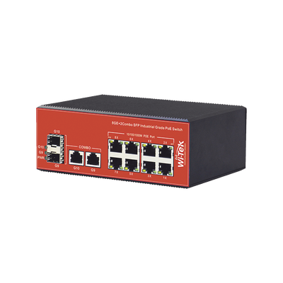 Switch industrial PoE+ WI-PS310GF-I de 8 puertos 10/100/1000Mbps y 2 SFP Combo. Dimensiones de 166 x 125 x 60 mm, fuente de alimentación de 48-55 V y 150 W. Sus puertos Gigabit ofrecen alta velocidad, con soporte PoE y un rendimiento óptimo. Ideal para redes de CCTV en entornos difíciles.