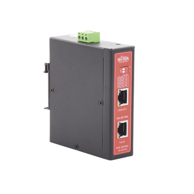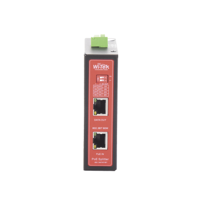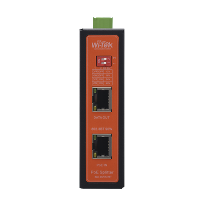 Divisor PoE WIPOE55SBTIDC 90W salida 12V/16V/24V/48V con protección de 6KV. Dimensiones: 186 x 93 x 41 mm. Interfaces de red: 2 RJ45 a 10/100/1000 Mbps. Ofrece flexibilidad mediante voltaje seleccionable y conexión de equipos a 100 metros sin extensores PoE. Ideal para aplicaciones industriales y sistemas CCTV.