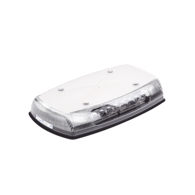 Mini barra de luces X-5590CB 12-24 Vcc 6 Amp -30°C a 50°C con domo de policarbonato color claro y LED azul. Ofrece 360° de advertencia superior y es resistente a impactos, ideal para seguridad privada.