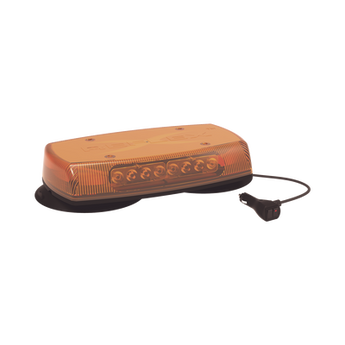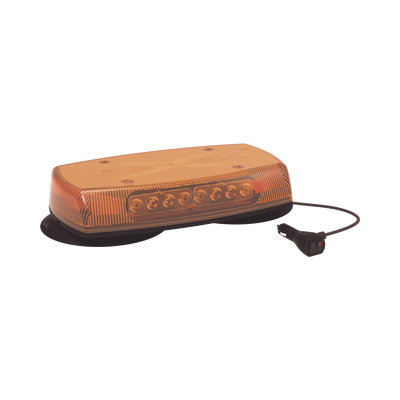 Mini barra de luces X5590-AVM de ECCO, ideal para montaje magnético. Funciona a 12-24 Vcc, con un consumo de 6 Amp. Rango de temperatura de -30°C a 50°C y dimensiones de 63mm x 381mm x 229mm. Domo de policarbonato, color ámbar y un beneficio esencial: advertencia de 360º para mayor visibilidad.