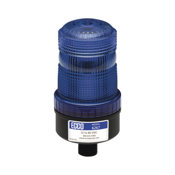 Mini baliza azul X6267-B 12-80 Vcc 0,12 amperios, cumple con SAE J845 clase III. Ideal para aplicaciones industriales y zonas de trabajo peligrosas. Montaje permanente, 8 flashes por ciclo (70 FPM) y rango de temperatura -22 °F a +122 °F. Base de nylon reforzado y protección contra sobretensiones, libre de mantenimiento.