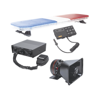 Kit básico para equipamiento de unidades de Seguridad Pública X67-RB-KIT que incluye una barra de luces LED de 118cm x 34cm x 12cm, certificaciones IP65 y SAE, sirena de 100W y bocina de 100W. Presenta una función de control de tráfico y 88 LED\%27S Ultra Brillantes.