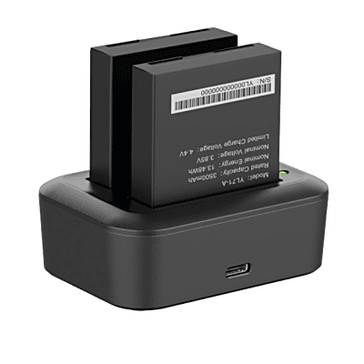 Base de carga dual XMRX5V2BATDOCK, carga rápida 2 baterías simultáneamente. Diseño compacto (75mm x 55mm x 27mm). Entrada: USB TYPE-C, 5V/2A. Soporta 2 salidas simultáneas de 5V/1.5A. Eficiencia de carga ≥95%25 y protección contra sobrecargas. Ideal para recargar baterías Bodycam XMRX5V2.