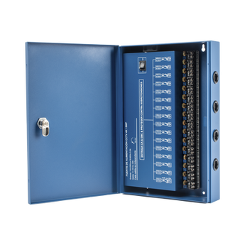 Fuente de poder profesional XP-16DC-20-4KV, 20A, 16 canales, ajustable de 11 a 15 Vcc, ideal para cámaras 4K. Opera con voltaje de entrada 110V - 220Vca, y cuenta con fusibles de protección individual. Perfecta para sistemas de seguridad electrónica, con 5 años de garantía.