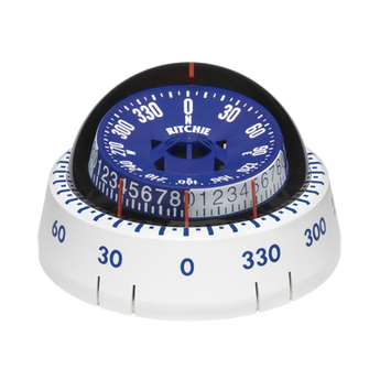 Brújula de navegación XP-98W en color blanco, con un diámetro de lectura de 3%22 (76 mm), montaje superficial y bajo, ideal para entornos extremos. Incluye dial táctico para seguimiento de cambios de viento y no requiere instalación eléctrica, lo que facilita su uso en espacios reducidos.