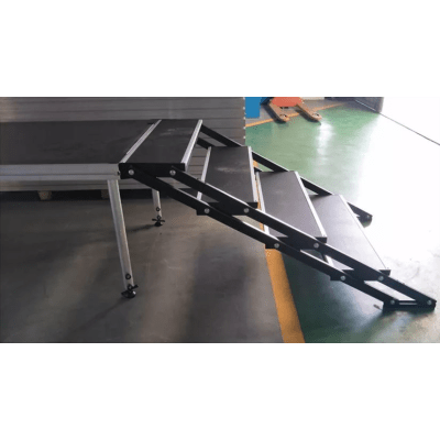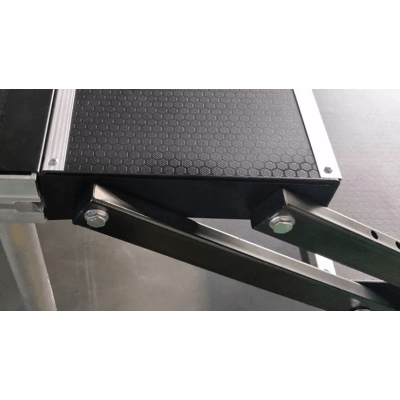 Escalera para tarima YSL1, altura ajustable de 100cm a 170cm, ancho 100cm, peso 31.92kg. Escalera de 4 peldaños y superficie anti derrapante para mayor seguridad al subir y bajar.